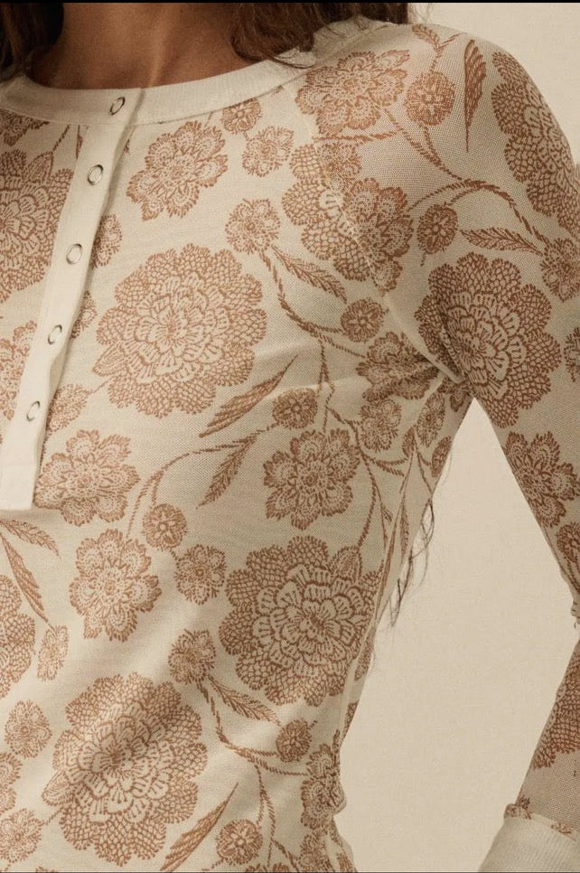 Stay on-trend with the Fauna Flora Mesh Top. The beautiful bell sleeves, fitted floral pattern, and ribbed collar add a touch of elegance to this casual top. With a snap detail and bell sleeve accents, this top is sure to turn heads