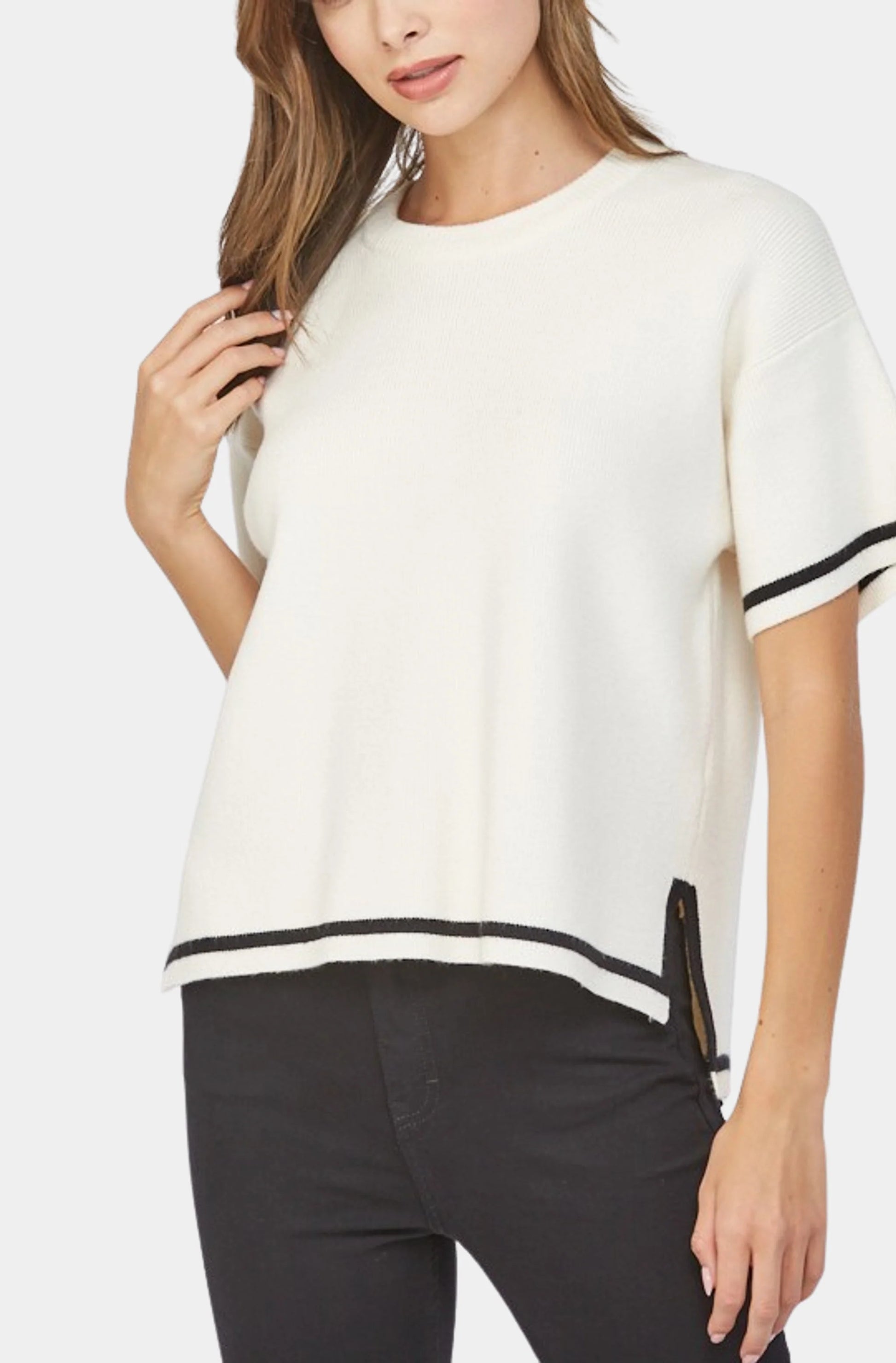 The Make it Count Top is your go-to for effortless style. Has a boxy fit, black detailing and side slits with a slightly longer length in back. A comfortable knit fabric, this short sleeve sweater is perfect for transitioning from work to leisure. Enjoy a relaxed look that keeps you feeling great all day long.