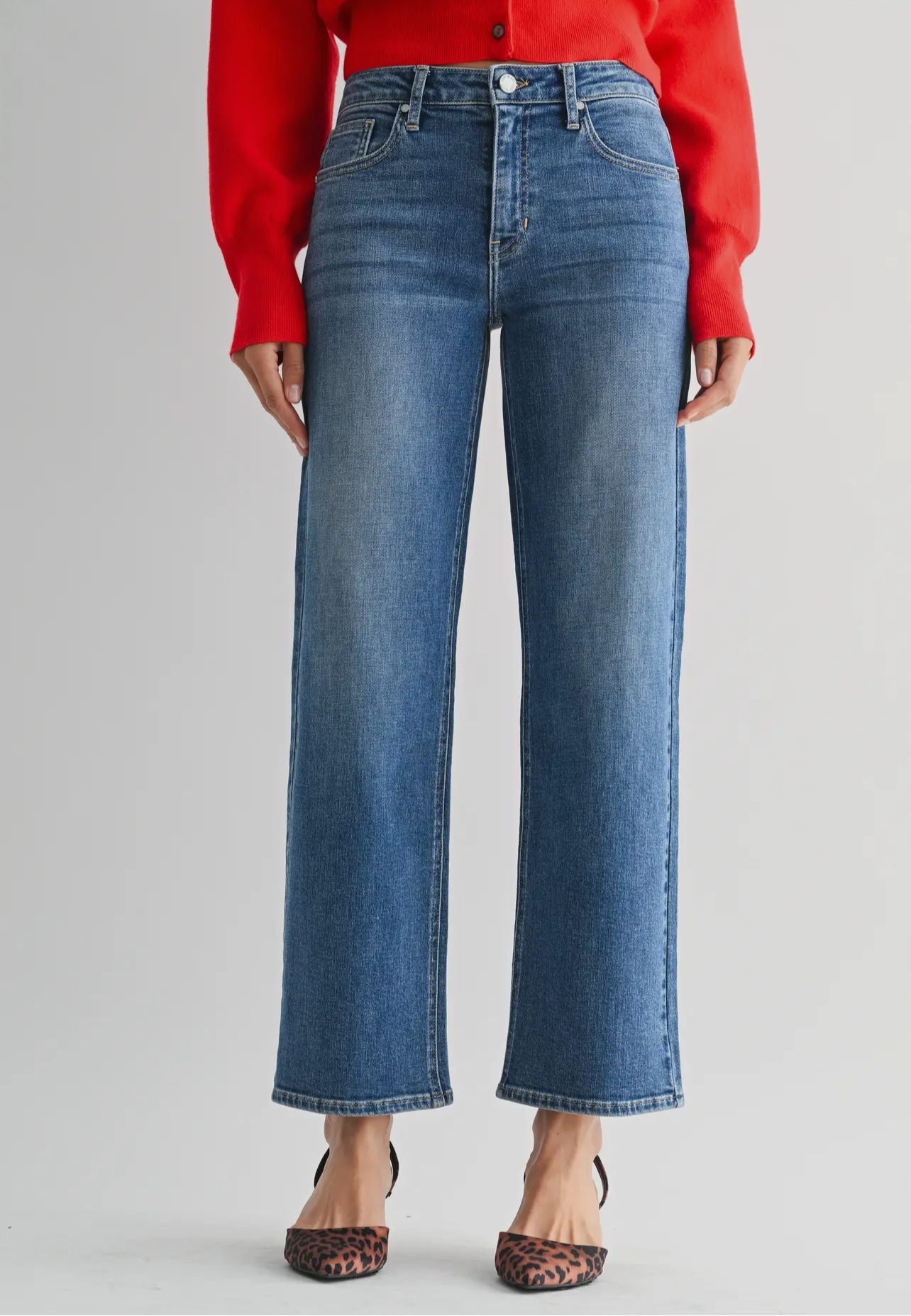 These Mid Rise Slim Wide Leg Jeans showcase a medium wash and a flattering mid-rise design. A Straighter fit through the leg creating a timeless silhouette that combines comfort with classic style. Ideal for versatile everyday wear.